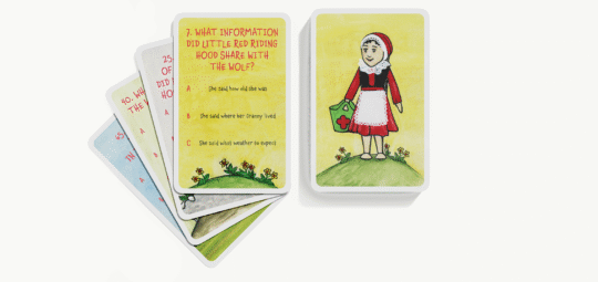 Hravé kvízové kartičky obsahují otázky, na které děti hledají správné odpovědi. Díky kvízu mohou tak více zapřemýšlet nad příslušnou pohádkou a jejími detaily. Na pomoc mají na výběr ze dvou nebo tří možností. Otázky jsou rozmanité – některé těžší, některé naopak jednodušší, tak aby bavily menší ale i starší děti. Některé vybrané možnosti jsou doplněny malovanými obrázky, které usnadní komunikaci i s těmi nejmenšími dětmi a trochu jim pomůže se správnou odpovědí.